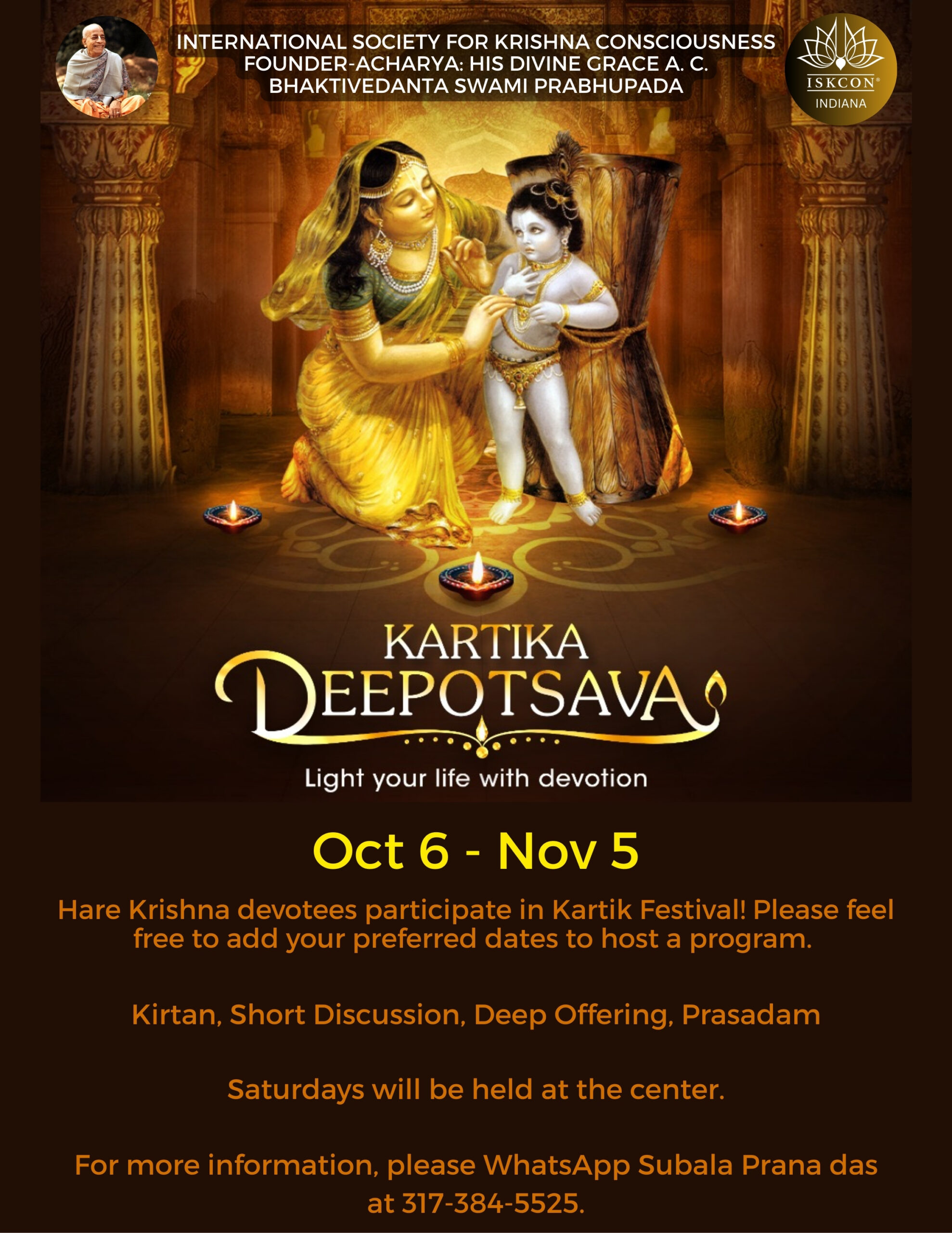 Join us every Saturday from 5 PM to 8 PM at our center for an uplifting spiritual journey. Participate in Kirtan, Bhagavad Gita discussions, Arati, and enjoy a delicious feast. Please invite your friends and family to attend as well. We look forward to seeing you soon.